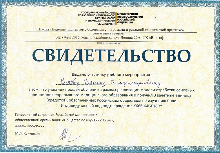 2016 г. - Координационный совет по развитию непрерывного медицинского и фармацевтического образования Министерства здравоохранения Российской Федерации, учебное мероприятие: «Ведение пациентов с болевыми синдромами в реальной клинической практике».