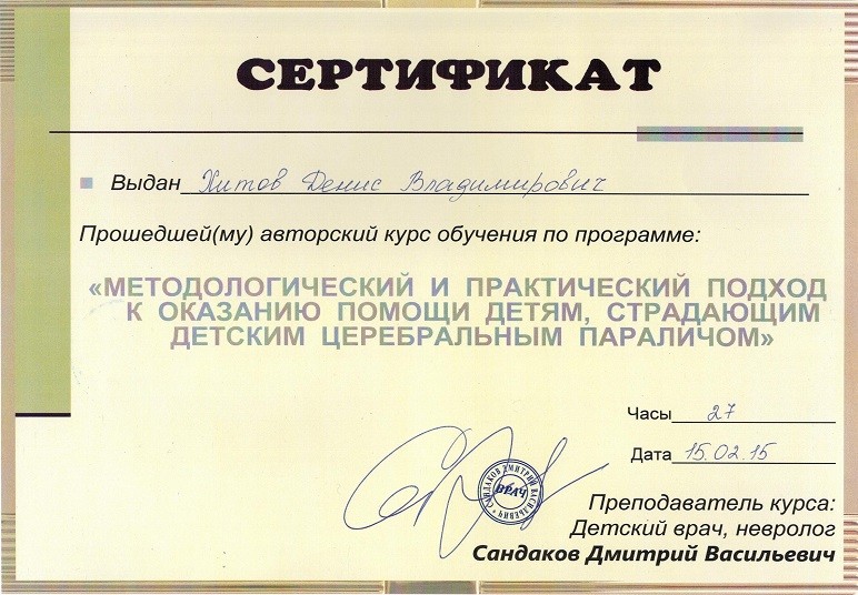 2015 г., 2018 г. - Авторский курс обучения по программе «Методический и практический подход к оказанию помощи детям, страдающим детским церебральным параличом», преподаватель детский врач невролог Сандаков Д. В.