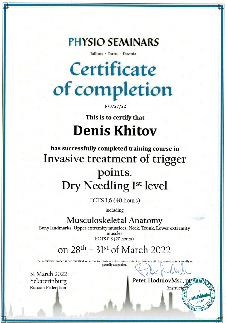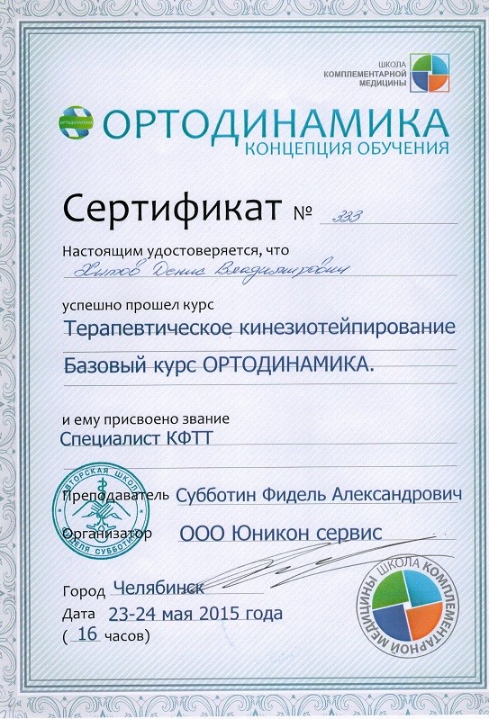2015 г. - Школа комплементарной медицины, курс «Терапевтическое кинезиотейпирование. Базовый курс ОРТОДИНАМИКА». Присвоено звание: специалист КФТТ (концепции функционального терапевтического тейпирования).