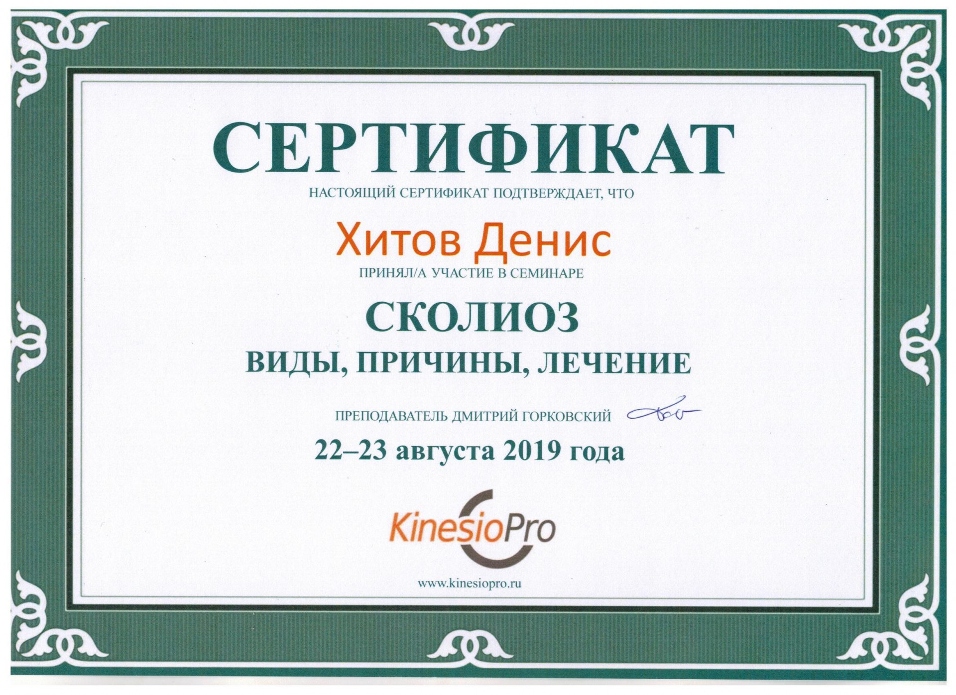 2019 г. - Участие в семинаре «Сколиоз – виды, причины, лечение», преподаватель Дмитрий Горковский.