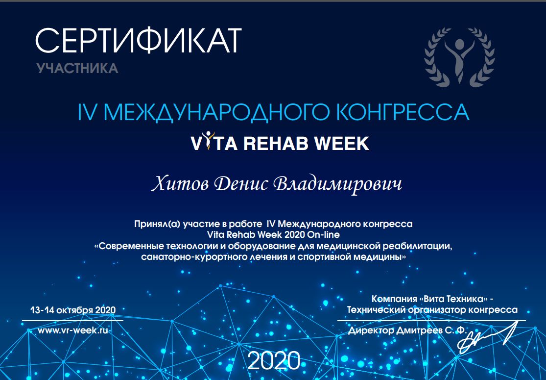 2020 г. - Участие в работе IV Международного конгресса Vita Rehab Week 2020 On-line «Современные технологии и оборудование для медицинской реабилитации, санаторно-курортного лечения и спортивной медицины».