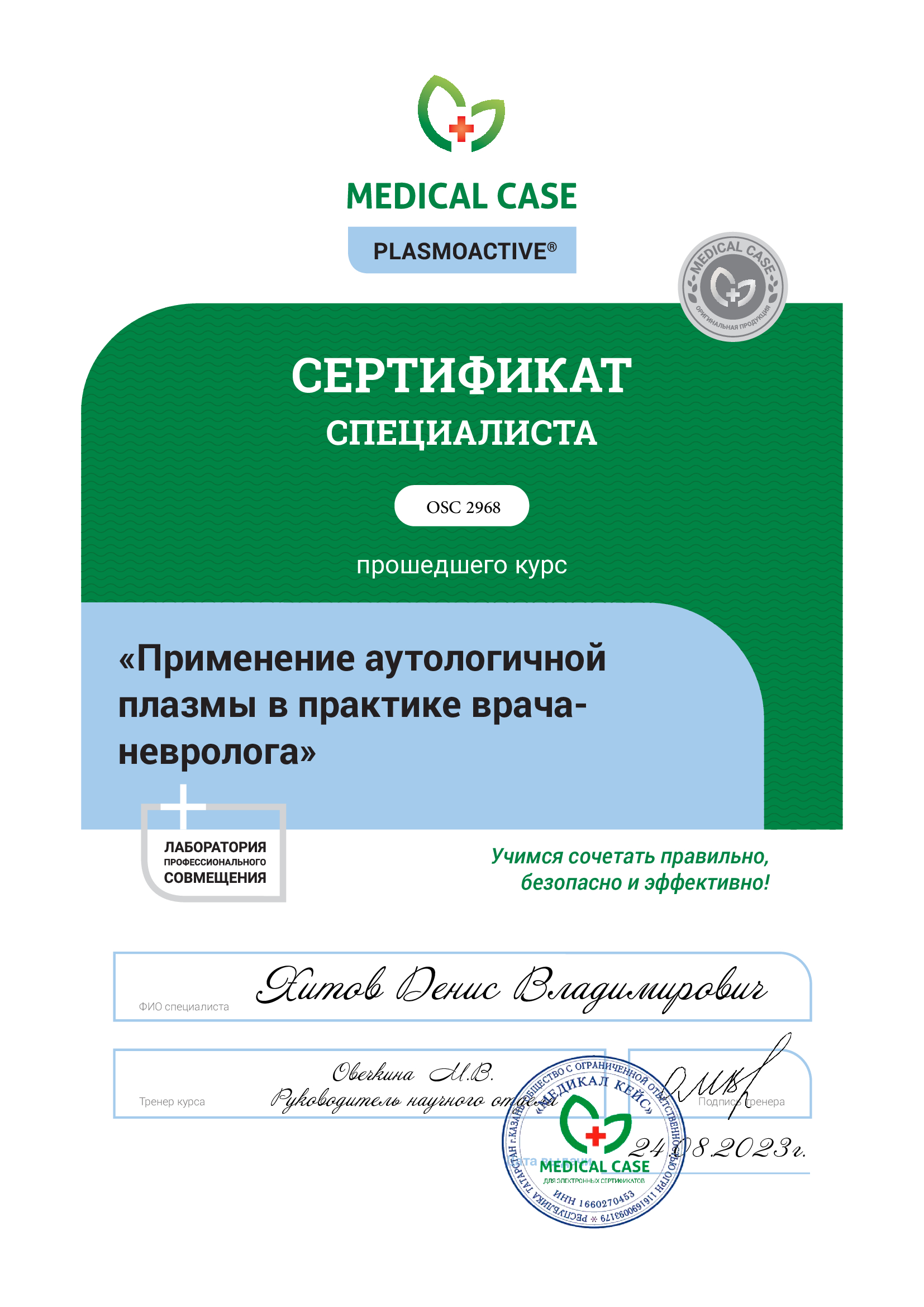 2023 г .- Лаборатория профессионального совмещения Medical Case, курс «Применение аутологичной плазмы в практике врача-невролога». Сертификат.