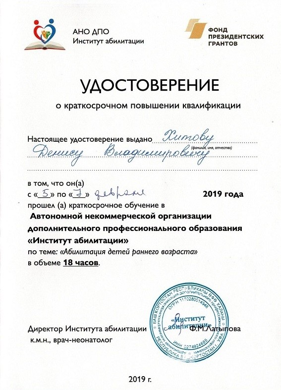 2019 г. - Обучение в Автономной некоммерческой организации дополнительного профессионального образования «Институт абилитации» по теме: «Абилитация детей раннего возраста».