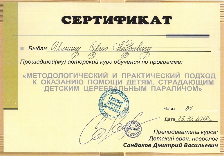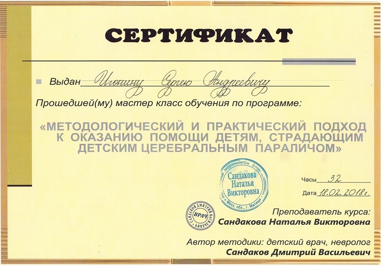 2017 г., 2018 г. - Авторский курс обучения по программе: «Методологический и практический подход к оказанию помощи детям, страдающим детским церебральным параличом». Автор методики — детский врач, невролог Сандаков Дмитрий Васильевич.