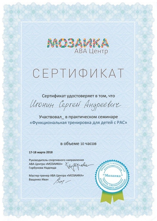 2018 г. - АВА Центр «Мозаика», практический семинар «Функциональная тренировка для детей с РАС». Сертификат.