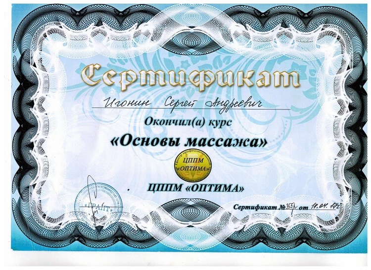 2017 г. - Центр профессиональной подготовки массажистов «ОПТИМА», курс обучения по программе «Основы массажа».