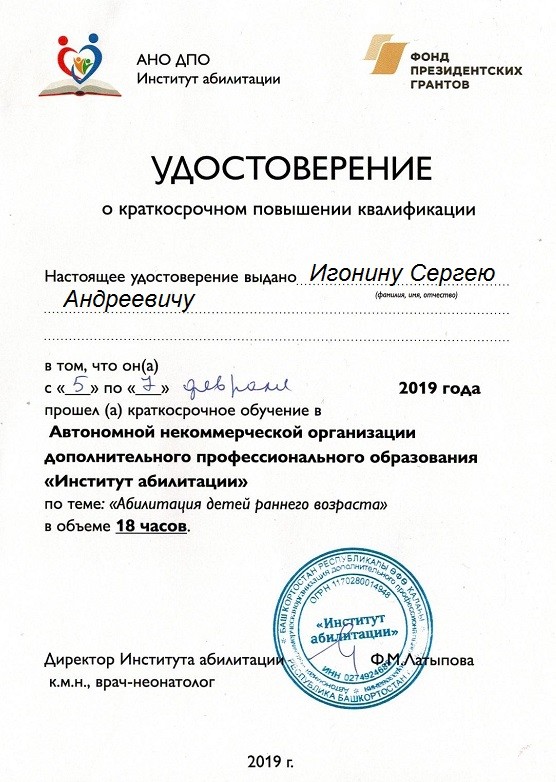 2019 г. - Обучение в Автономной некоммерческой организации дополнительного профессионального образования «Институт абилитации» по теме: «Абилитация детей раннего возраста».