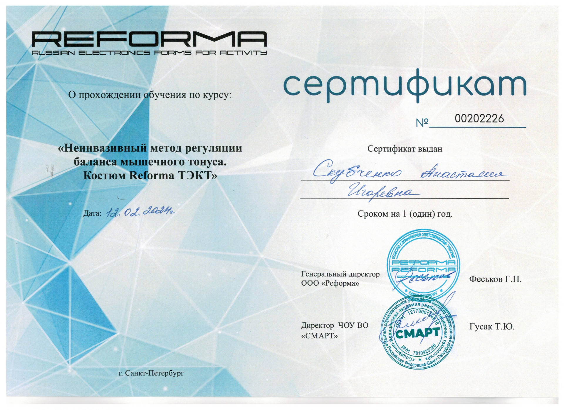 2024г. - Частное образовательное учреждение высшего образования «Социально-медицинская академия реабилитационных технологий», обучение по курсу: «Неинвазимный метод регуляции баланса мышечного тонуса. Костюм Reforma ТЭКТ» (г. Санкт-Петербург). Сертификат.