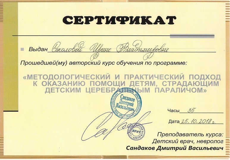 2018г. - Авторский курс обучения по программе: «Методологический и практический подход к оказанию помощи детям, страдающим детским церебральным параличом». Автор методики — детский врач, невролог Сандаков Дмитрий Васильевич.